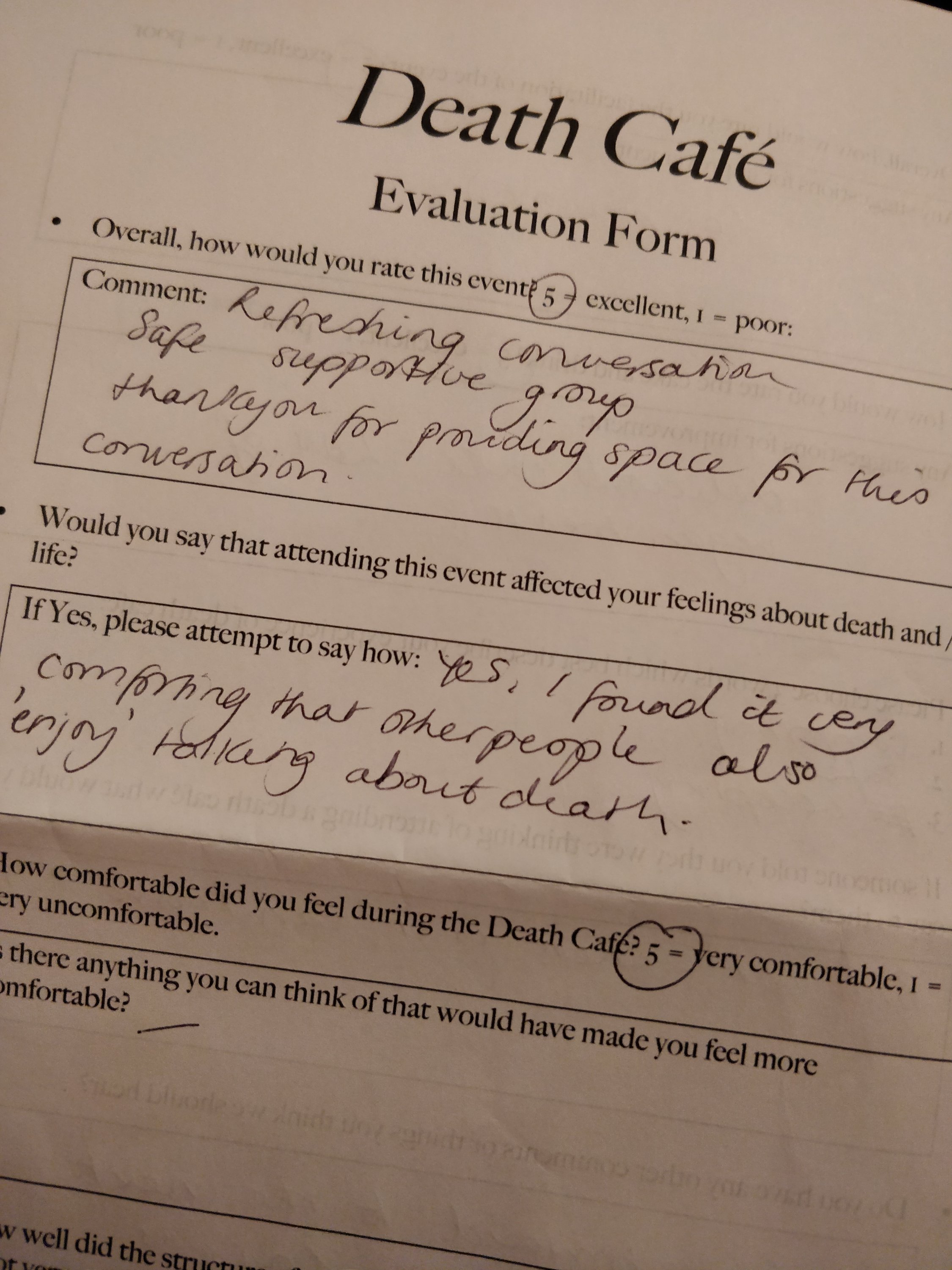 Among many things, we talked about our loved ones dying, our own death, our funeral wishes, feeling ill-prepared for the dying process.