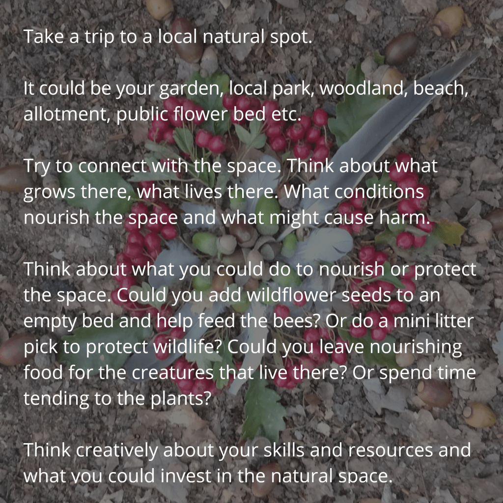 We could start relearning how to live reciprocally with the natural world by using our creativity. What skills, ideas, knowledge and resources do you have that you could utilise to give back to nature?