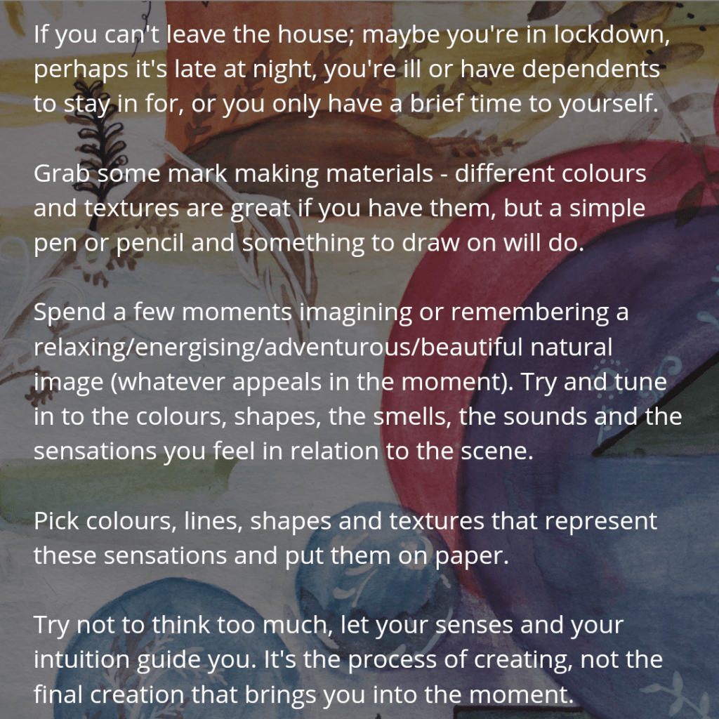 But we’ve nearly always got memories of natural spaces we can go to. Or fantasy environments and scenes we can conjure up. We can work creatively with how we experience these images of nature. Whilst not focusing on your current physical environment, you are focusing intentionally on a natural scene or memory and connecting with the feelings that come up in relation to it in the here and now.